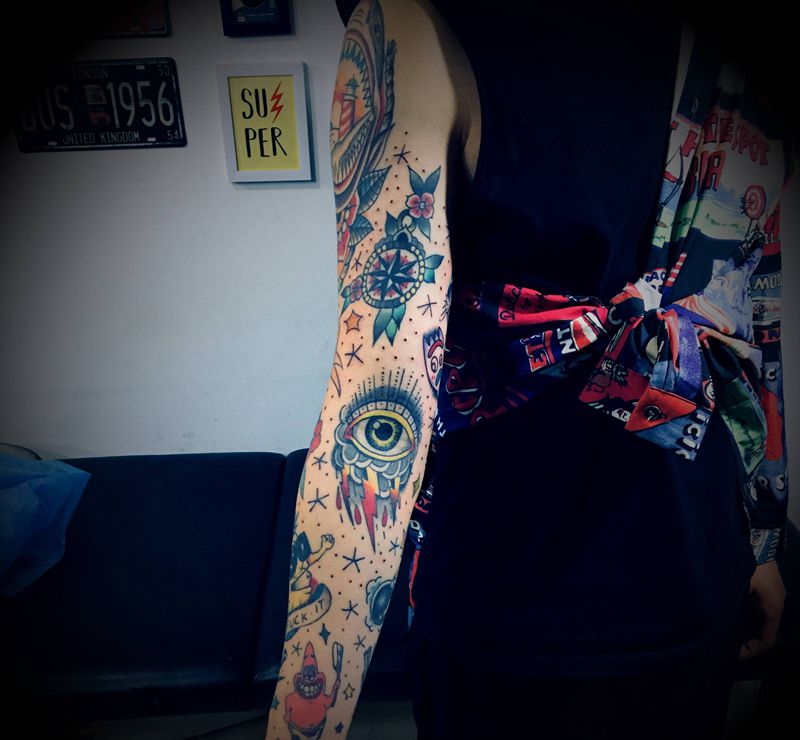 当前位置: 首页 >吉林省长春市纹身店-金楹刺青纹身图案>school 拼接花臂纹身图片_手臂肩部New SchoolOld School纹身图案
