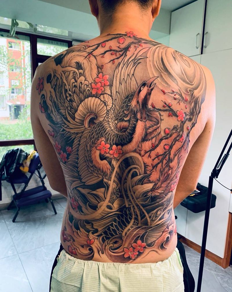 当前位置: 首页 >吉林省长春市纹身店-长春義色刺青纹身图案>满背凤凰鲤鱼纹身图片
