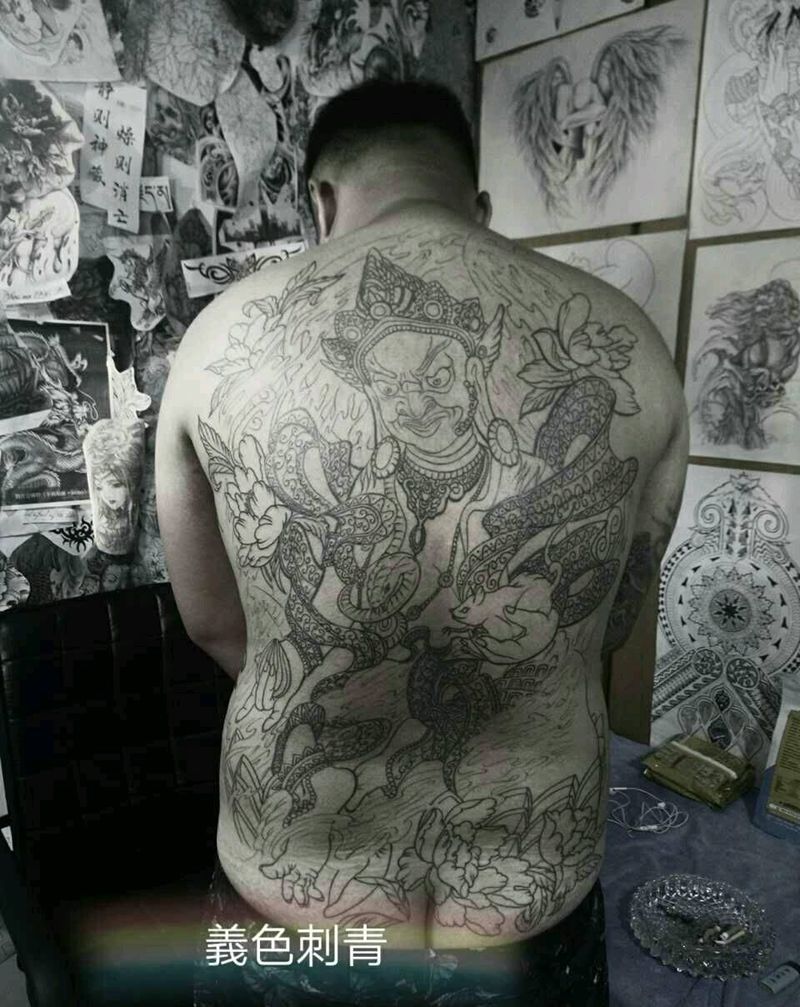 当前位置: 首页 >吉林省长春市纹身店-长春義色刺青纹身图案>满背财宝天王线条完成纹身图片