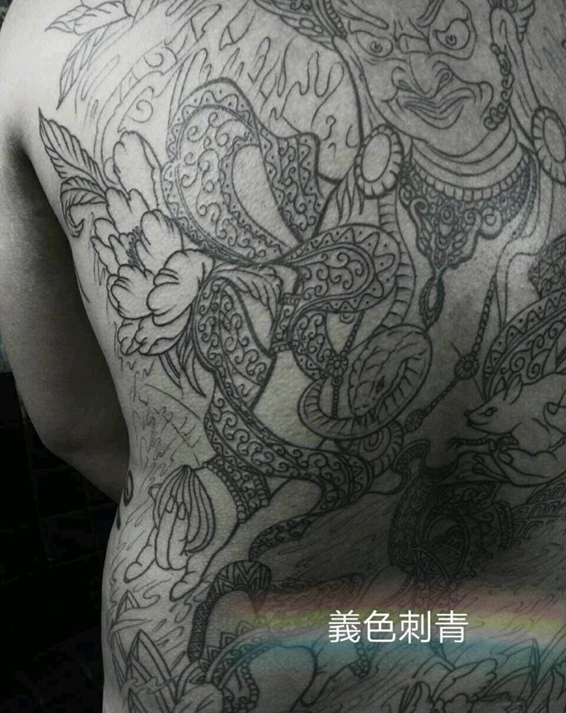 当前位置: 首页 >吉林省长春市纹身店-长春義色刺青纹身图案>满背财宝天王线条完成纹身图片