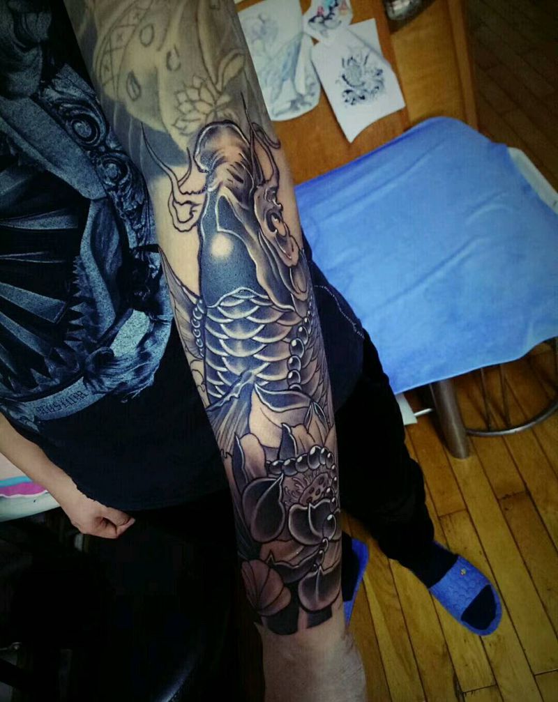 当前位置: 首页 >吉林省长春市纹身店-长春義色刺青纹身图案>包小臂!鲤鱼荷花!纹身图片