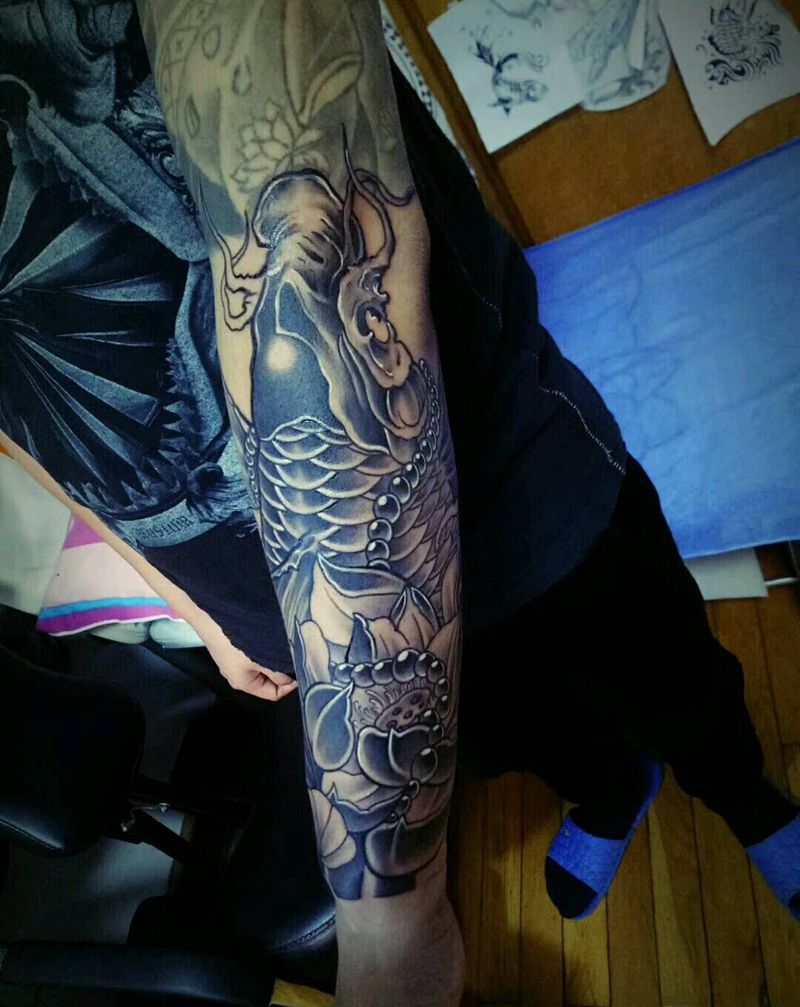 当前位置: 首页 >吉林省长春市纹身店-长春義色刺青纹身图案>包小臂!鲤鱼荷花!纹身图片