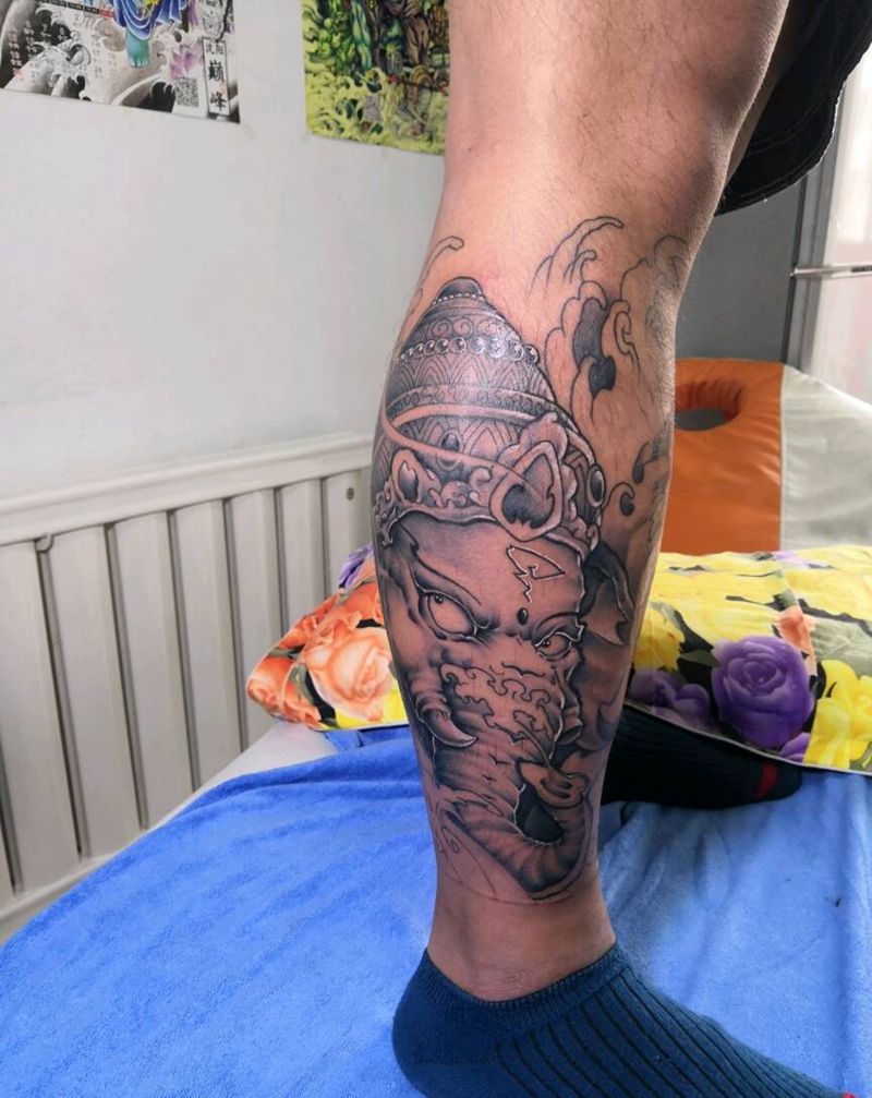 当前位置: 首页 >吉林省长春市纹身店-长春義色刺青纹身图案>包小腿,象神+荷花。上色未完成纹身图片