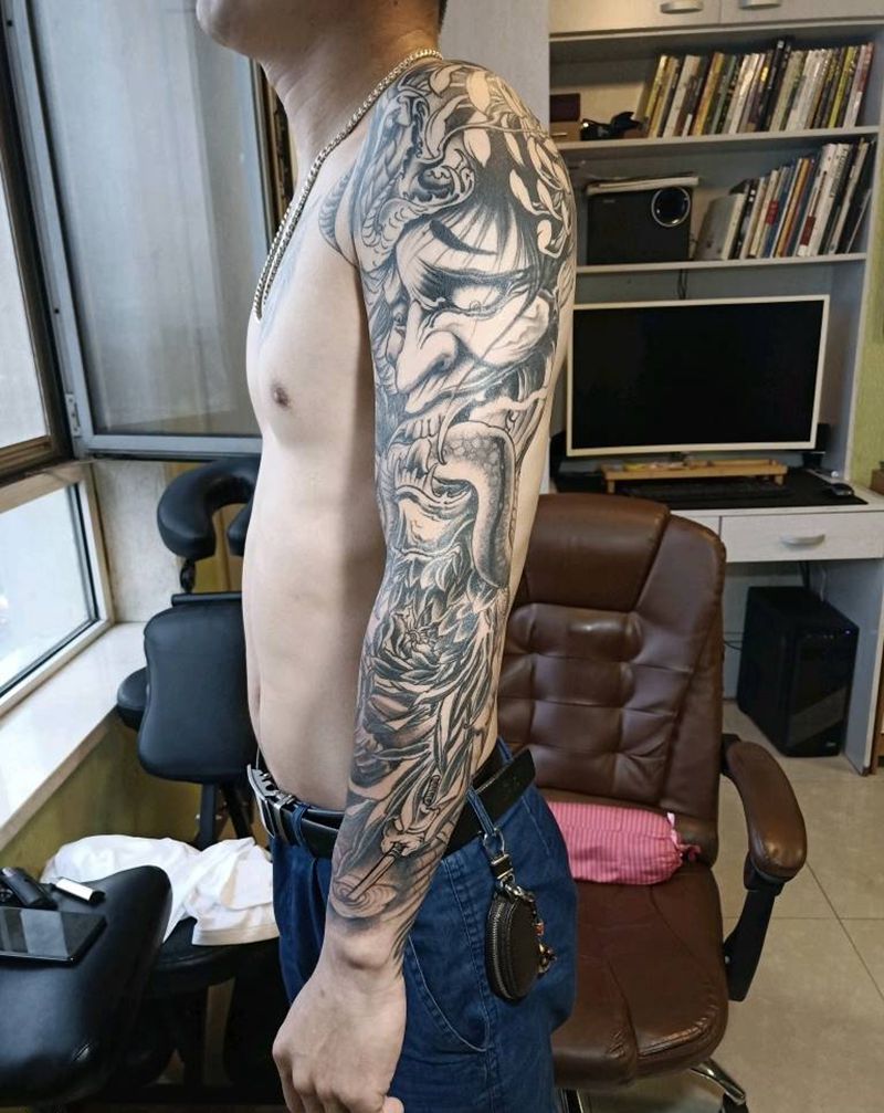 花臂加前胸遮盖纹身图片_手臂胸部新传统纹身图案