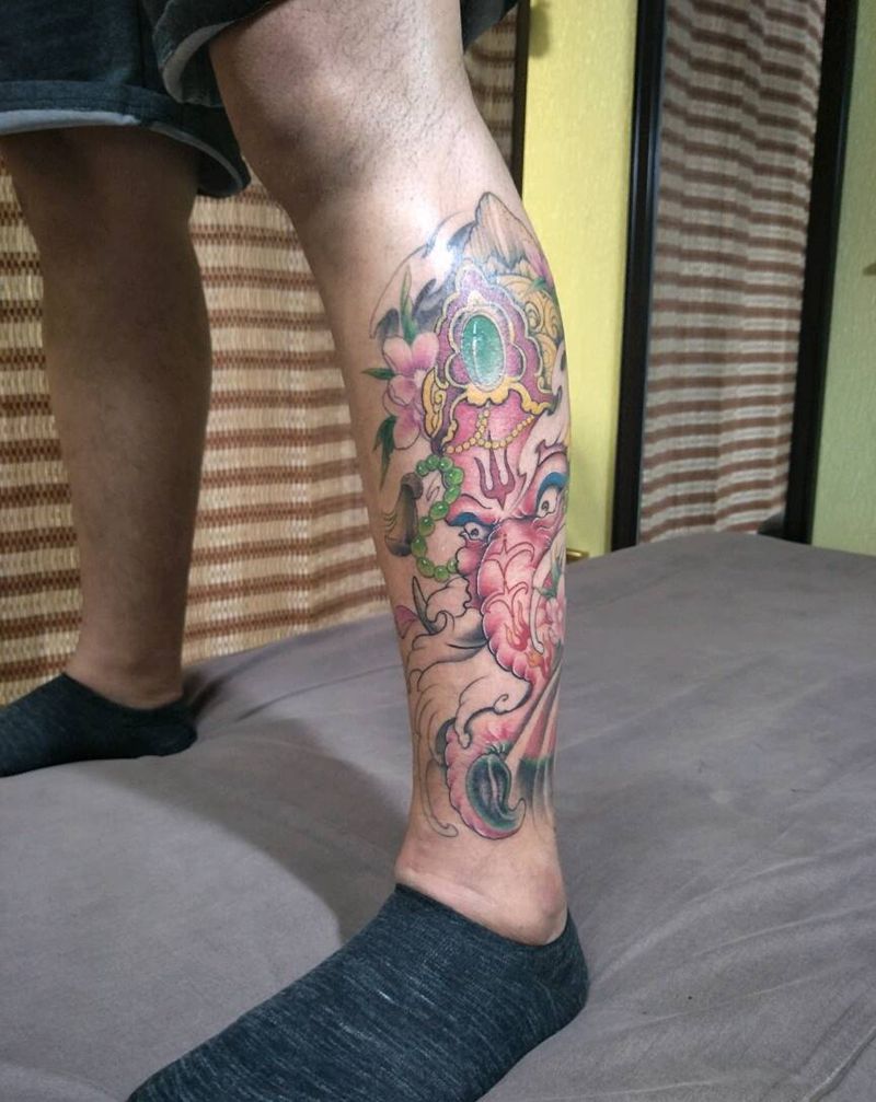 当前位置: 首页 >吉林省吉林市纹身店-少帅刺青工作室纹身图案>彩色象神小腿纹身图片_腿部纹身图案