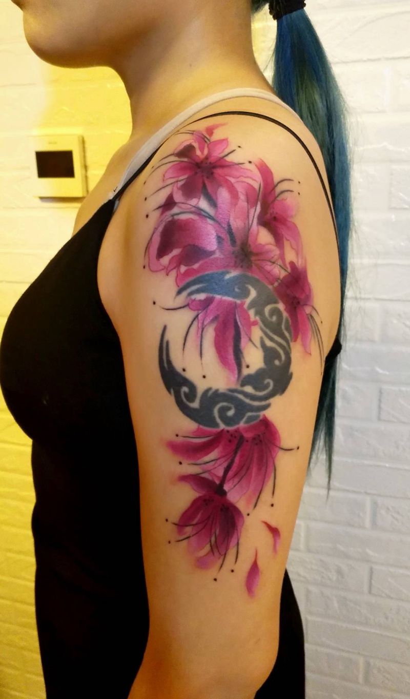 当前位置: 首页 >吉林省四平市纹身店-艳阳天刺青纹身图案>彼岸花纹身图片_手臂水彩图案添加纹身图案