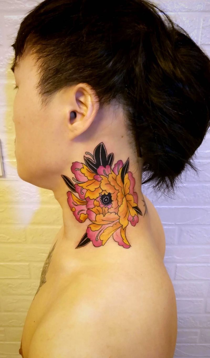 牡丹花纹身图片_颈部新传统New School纹身图案