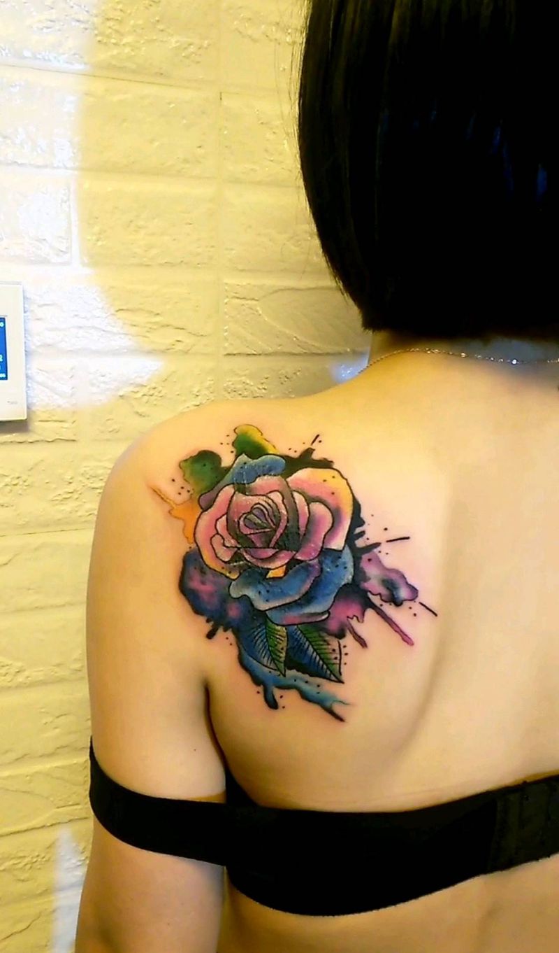 玫瑰花,遮盖作品纹身图片_肩部水彩纹身图案