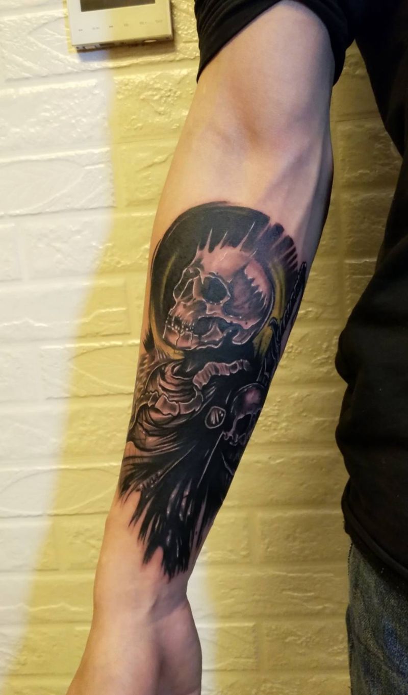 当前位置: 首页 >吉林省四平市纹身店-艳阳天刺青纹身图案>骷髅骑士纹身图片_手臂欧美写实暗黑系纹身图案