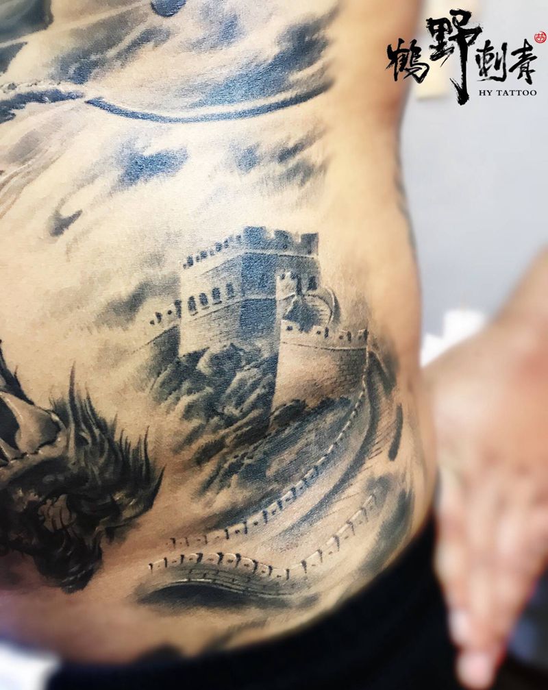 龙游华夏14纹身图片_胸部腹部新传统龙长城纹身图案
