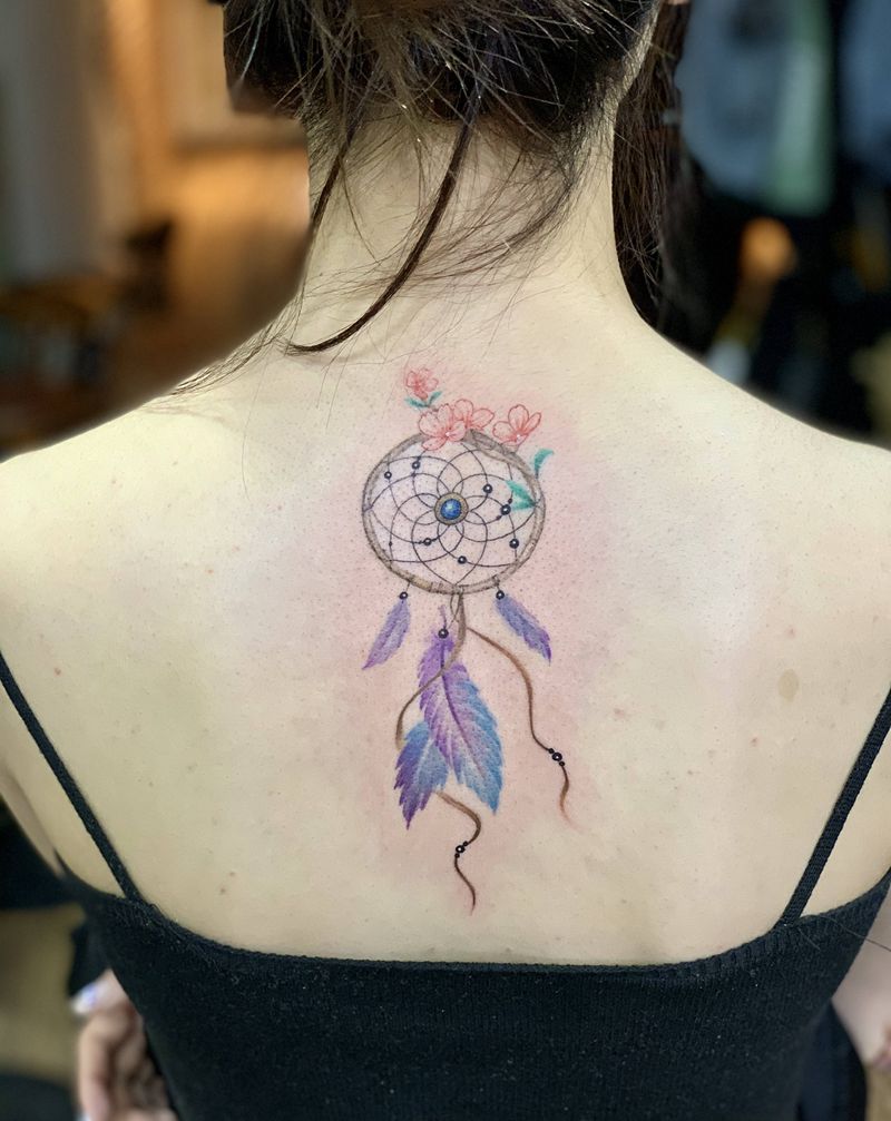 捕梦网纹身图片_背部水彩水墨纹身图案