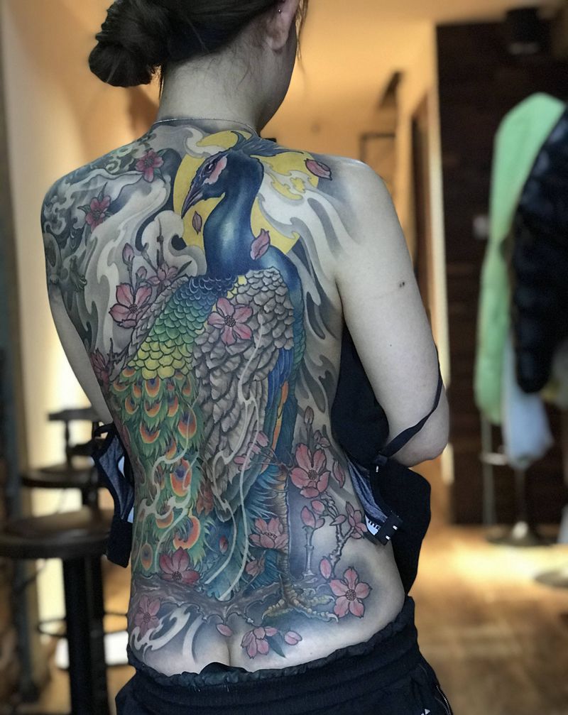 孔雀遮盖图腾纹身图片_背部新传统纹身图案