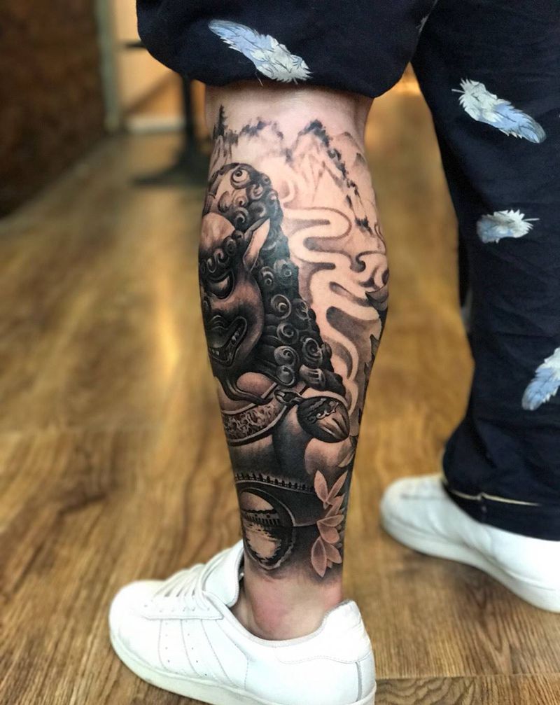 当前位置: 首页 >吉林省吉林市纹身店-律动刺青纹身图案>山水石狮纹身图片_成品腿部写实国画宗教动物鬼神静物原创纹身图案