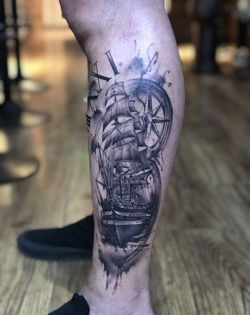 帆船纹身图片_腿部纹身图案