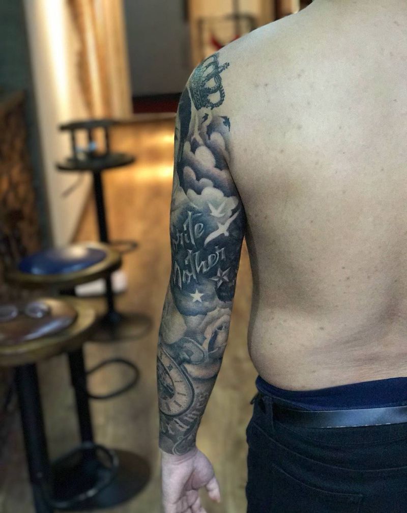 当前位置: 首页 >吉林省吉林市纹身店-律动刺青纹身图案>肖像花臂纹身图片_手臂欧美写实花体字肖像怀表纹身图案