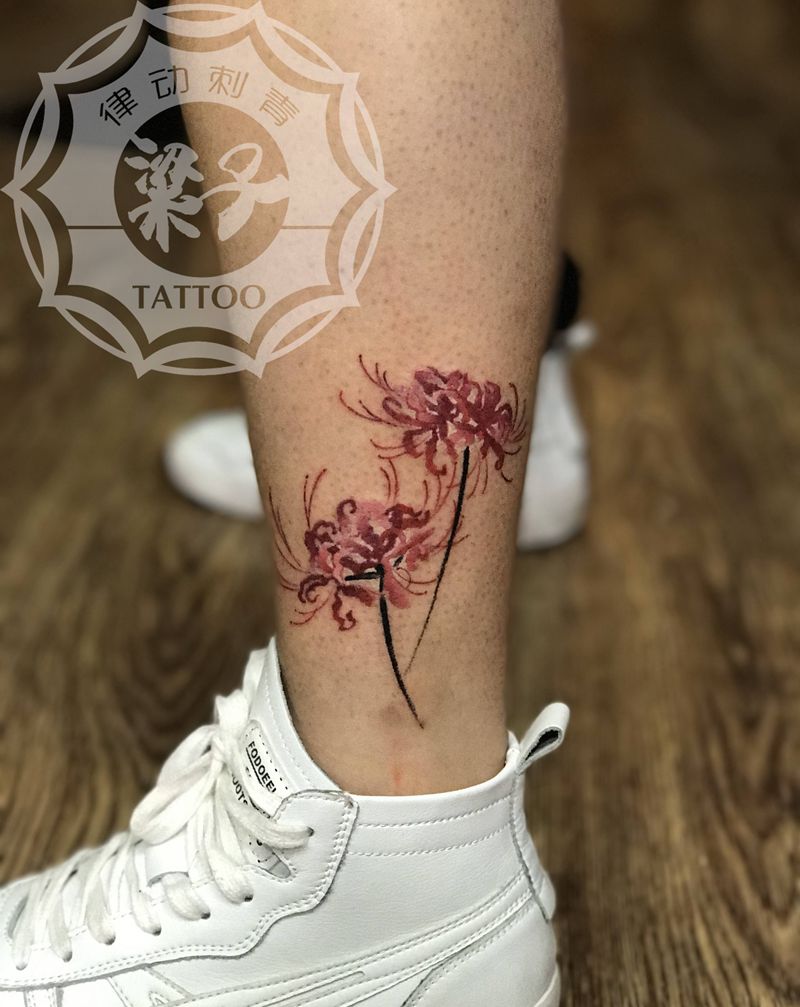 彼岸花纹身图片_脚部水彩水墨纹身图案
