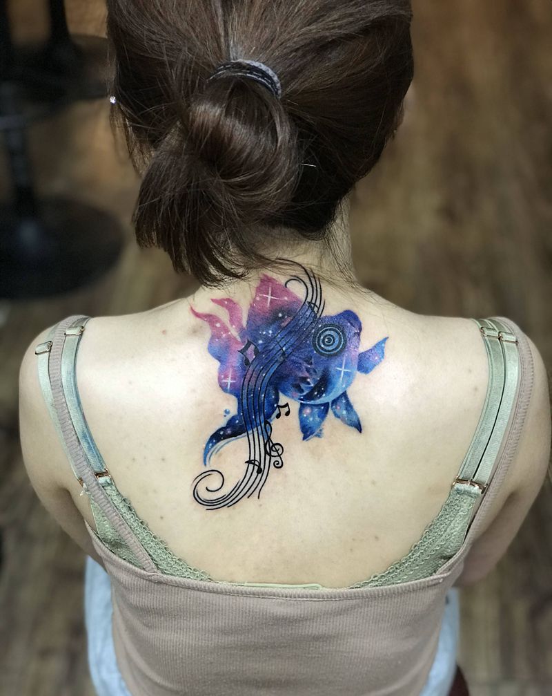 金鱼遮盖金鱼纹身图片_背部水彩图腾纹身图案