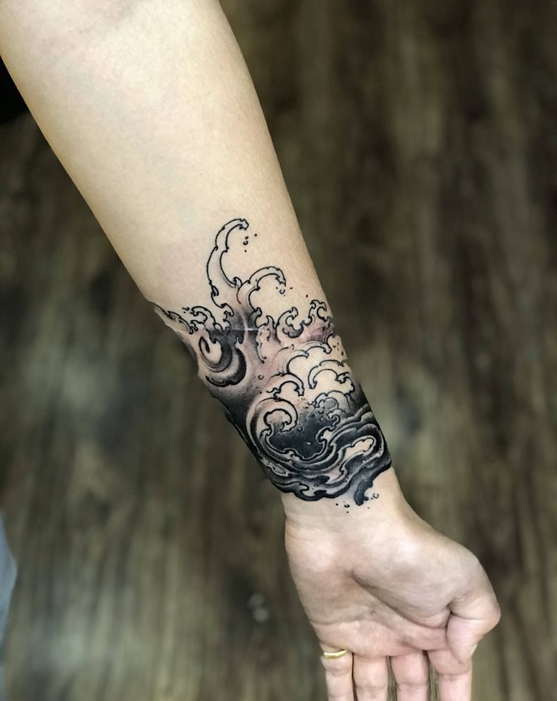浪花遮盖疤痕纹身图片_手臂水墨新传统纹身图案