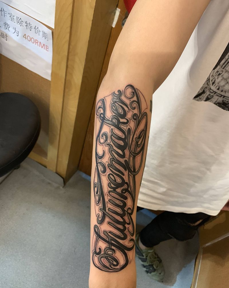 当前位置: 首页 >吉林省长春市纹身店-山猫刺青纹身图案>原创奇卡诺花体字纹身图片_手臂花体字纹身图案