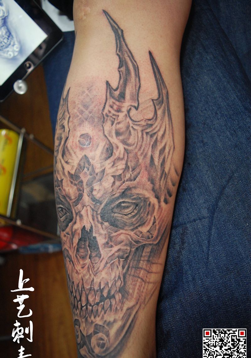 当前位置: 首页 >吉林省通化市纹身店-上艺刺青纹身图案>骷髅王子纹身图片_腿部手臂欧美写实点刺纹身图案