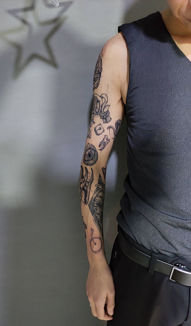 当前位置: 首页 >吉林省吉林市纹身店-牟刺青纹身图案>暗黑拼接纹身图片_手臂欧美写实New School暗黑羊龙纹身图案