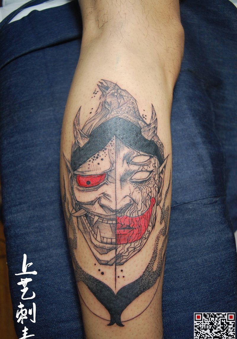 当前位置: 首页 >吉林省通化市纹身店-上艺刺青纹身图案>阴阳脸纹身图片_腿部手臂点刺纹身图案