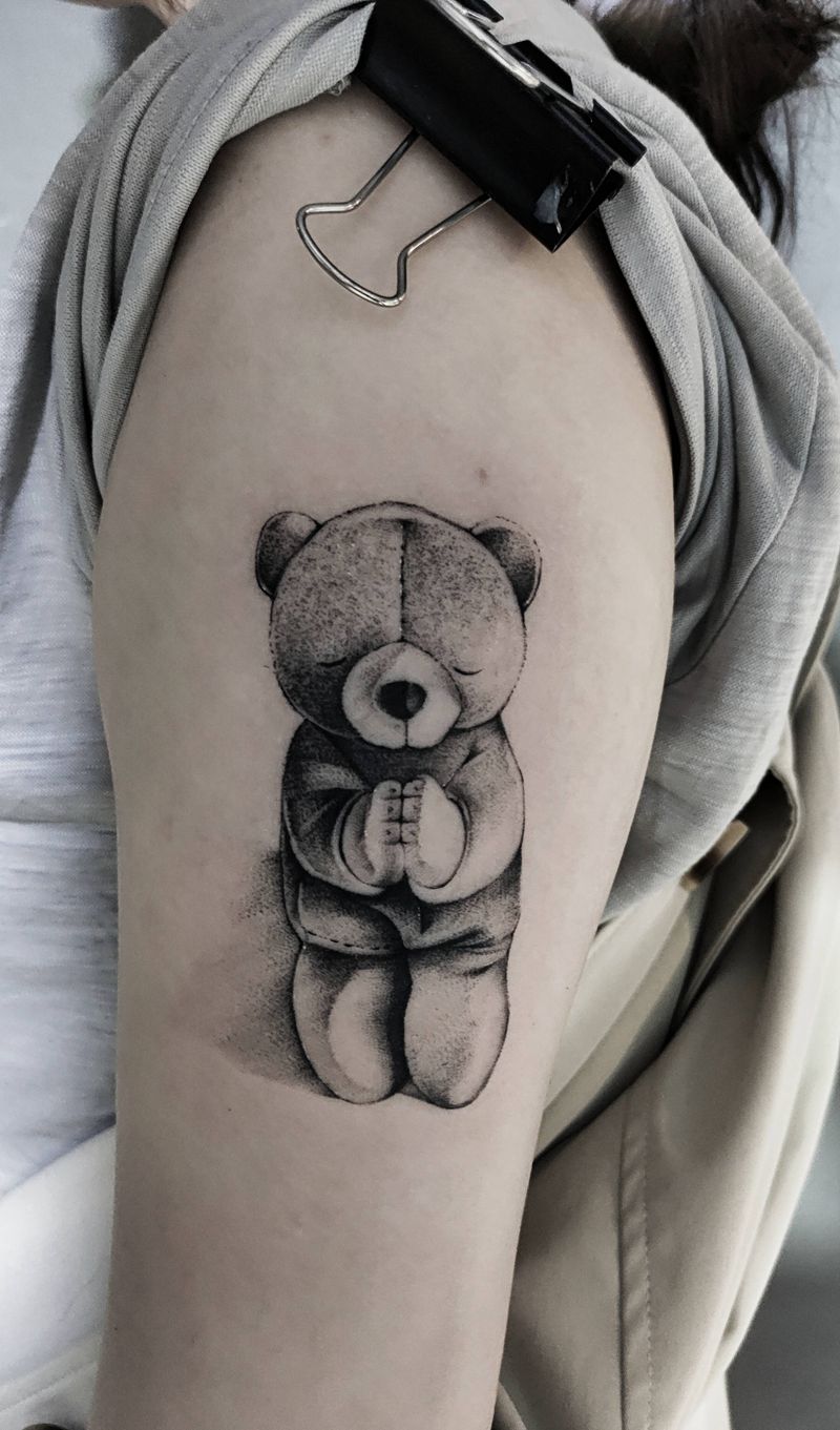 当前位置: 首页 >吉林省吉林市纹身店-牟刺青纹身图案>出家的小熊纹身图片_手臂欧美写实点刺熊布偶纹身图案
