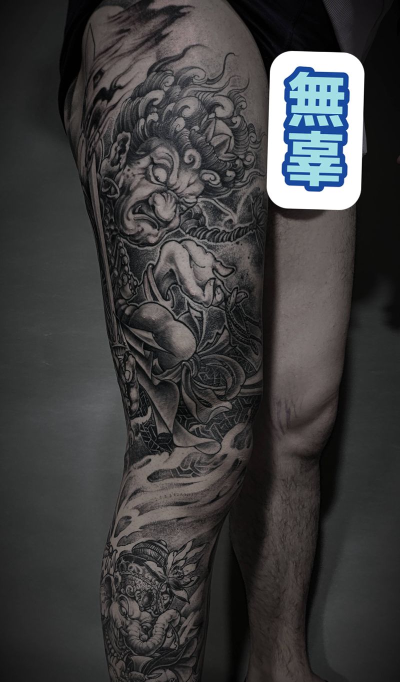 新传统花腿纹身图片_腿部新传统象神般若不动明王纹身图案