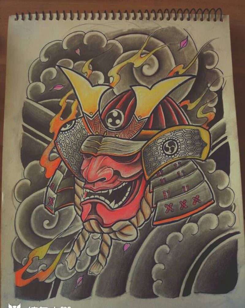 当前位置: 首页 >吉林省吉林市纹身店-牟刺青纹身图案>原创武士纹身图片_手臂传统人物鬼神成品手稿纹身图案