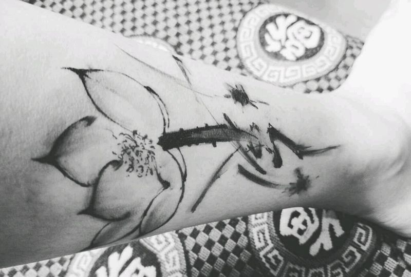 当前位置: 首页 >吉林省吉林市纹身店-牟刺青纹身图案>水墨纹身图片_腿部传统国画植物成品纹身图案