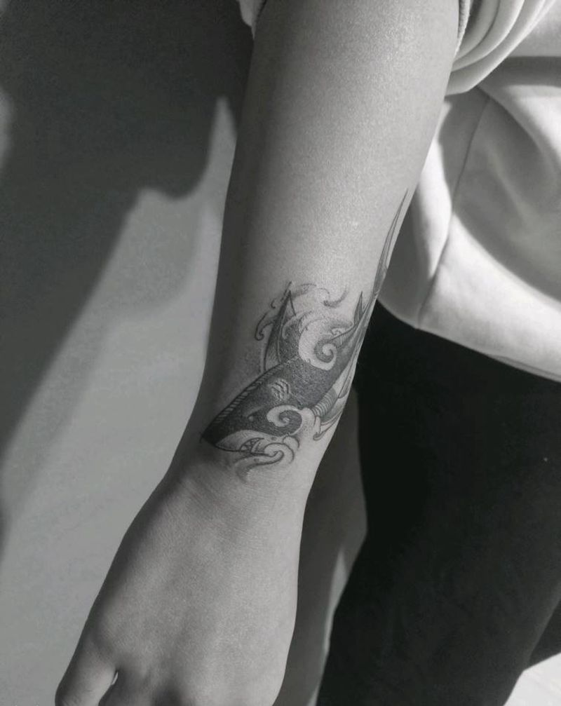 鲨鱼遮盖纹身图片_手臂几何水墨鲨鱼遮盖纹身图案