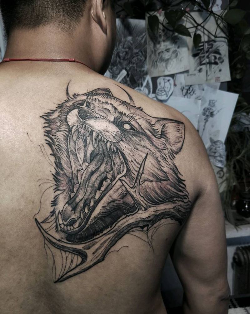 当前位置: 首页 >吉林省吉林市纹身店-牟刺青纹身图案>大灰狼纹身图片_肩部几何点刺纹身图案