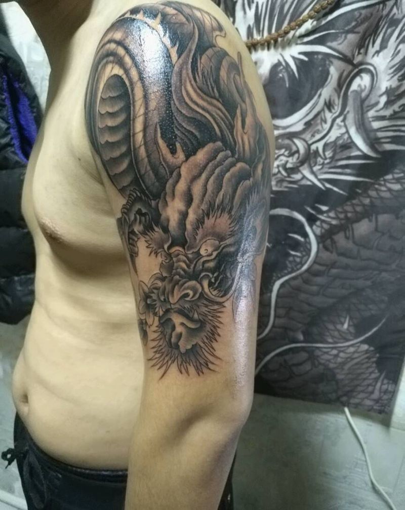 • T网红王老大花腿龙纹身图片_腿部新传统纹身图案