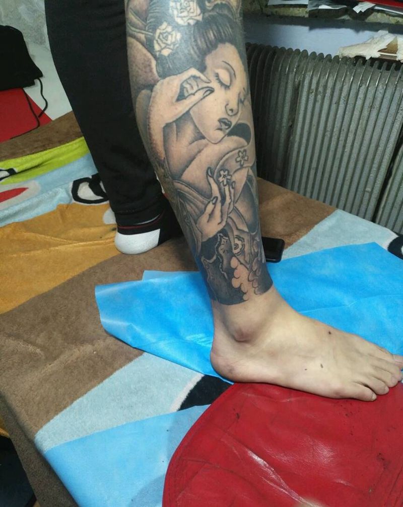 • T包小腿吹火男+阿多福纹身图片_腿部老传统新传统吹火男阿