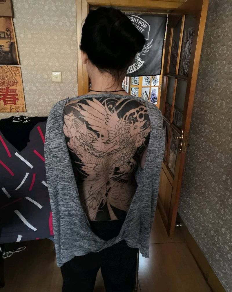 满背凤凰纹身图片_背部新传统老传统纹身图案