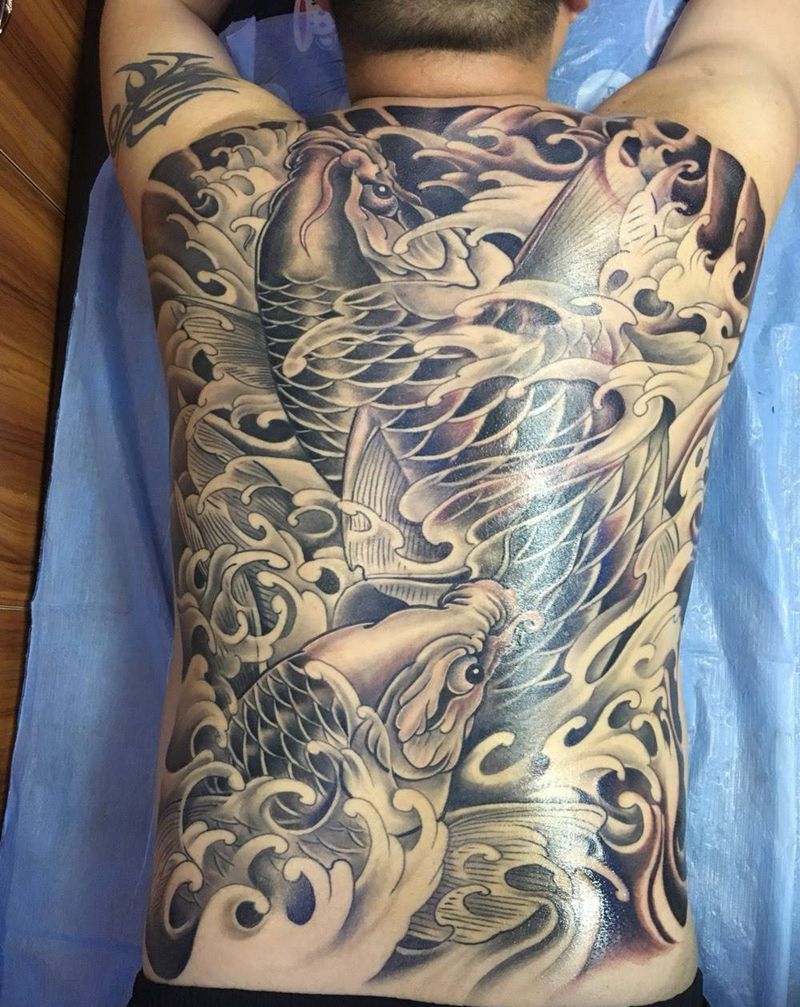 当前位置: 首页 >吉林省吉林市纹身店-纹绣堂刺青纹身图案>大鲤鱼纹身图片_成品背部传统动物纹身图案