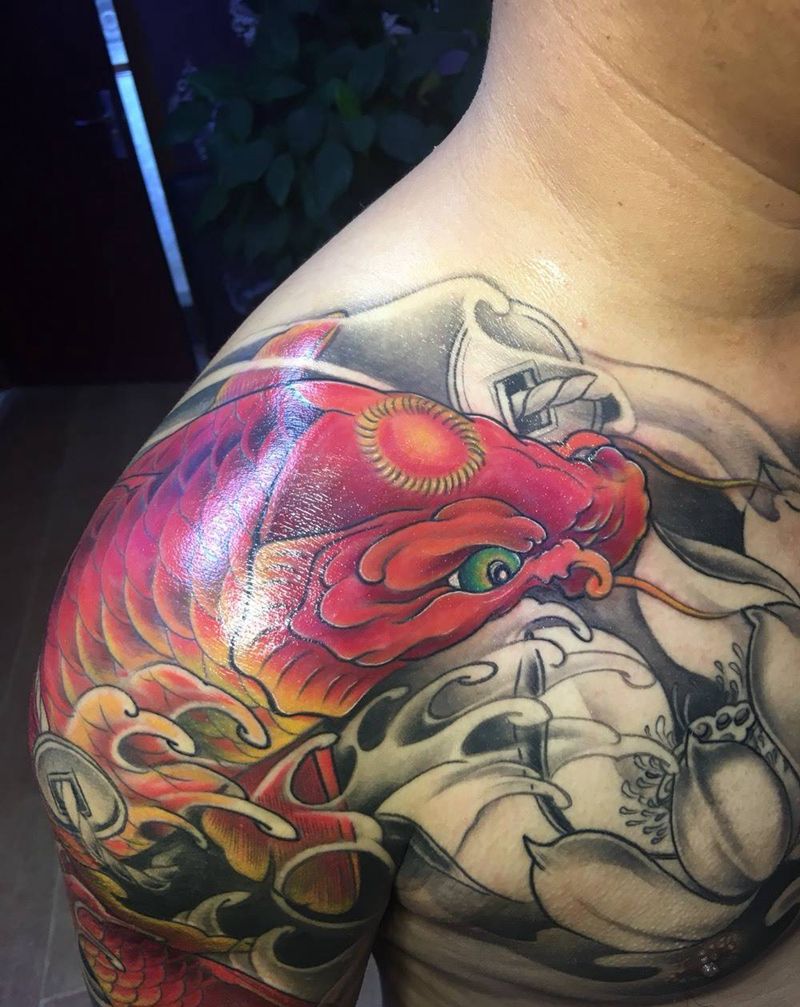 半甲鲤鱼纹身图片_原创动物传统胸部肩部成品纹身图案