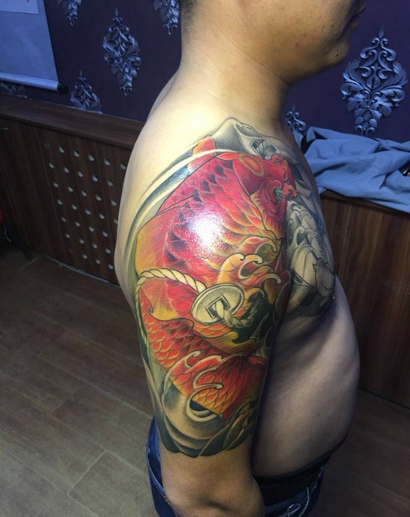 半甲鲤鱼纹身图片_原创动物传统胸部肩部成品纹身图案
