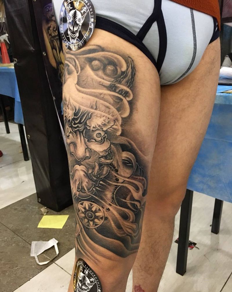 • T网红王老大花腿龙纹身图片_腿部新传统纹身图案
