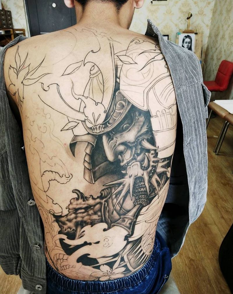 鬼武士纹身图片_背部新传统未完成纹身图案