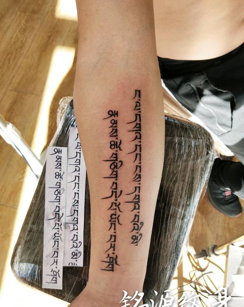当前位置: 首页 >吉林省松原市纹身店-铭源纹身纹身图案>梵文纹身图片_手臂图腾花体字纹身图案