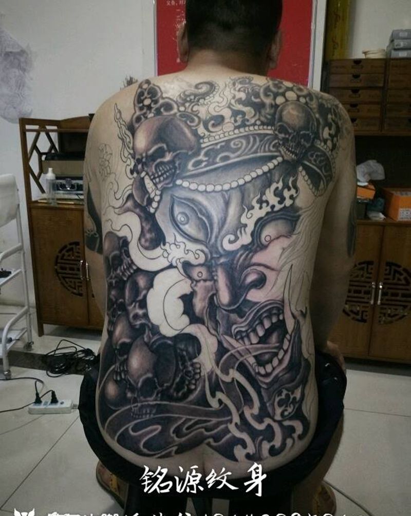 大黑天纹身图片_背部传统鬼神未完成纹身图案