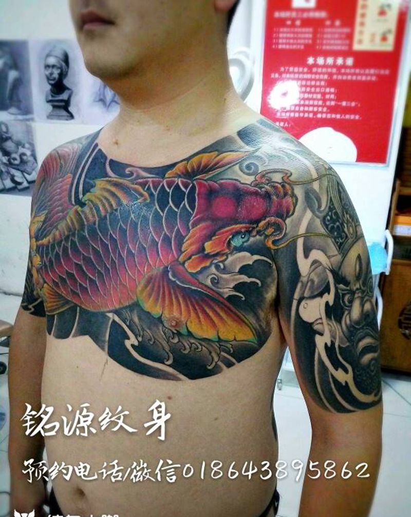 鲤鱼遮盖纹身图片_胸部传统鲤鱼成品纹身图案