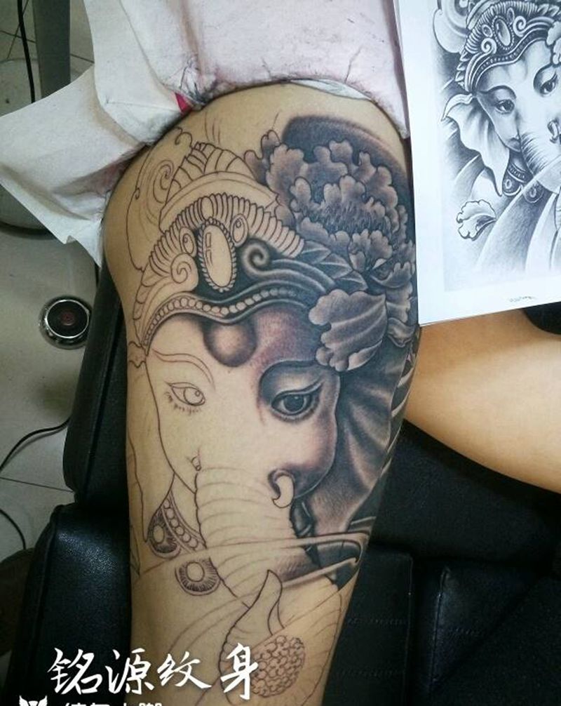 小象纹身图片_腿部传统人物成品纹身图案