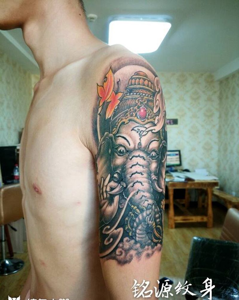 当前位置: 首页 >吉林省松原市纹身店-铭源纹身纹身图案>上臂象神纹身图片_手臂传统人物成品纹身图案