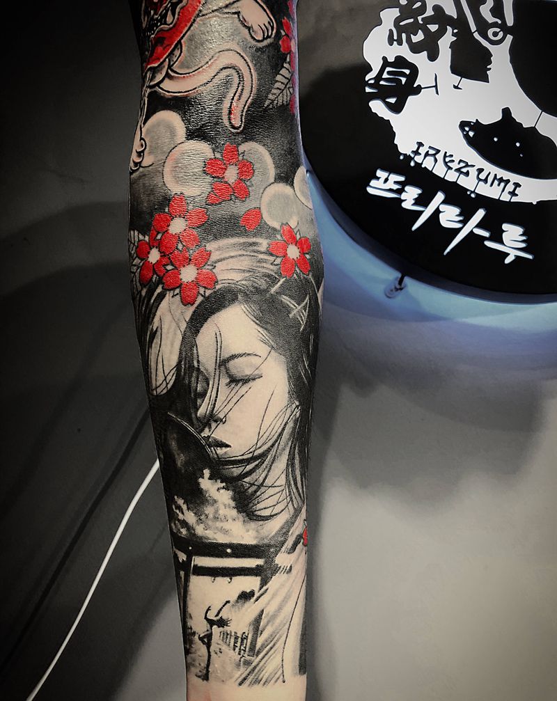 当前位置: 首页 >吉林省延边朝鲜族自治州纹身店-自有纹身纹身图案>艺妓花臂完成纹身图片_手臂纹身图案