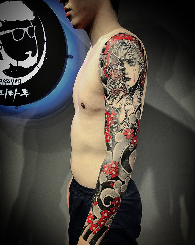 当前位置: 首页 >吉林省延边朝鲜族自治州纹身店-自有纹身纹身图案>艺妓花臂完成纹身图片_手臂纹身图案