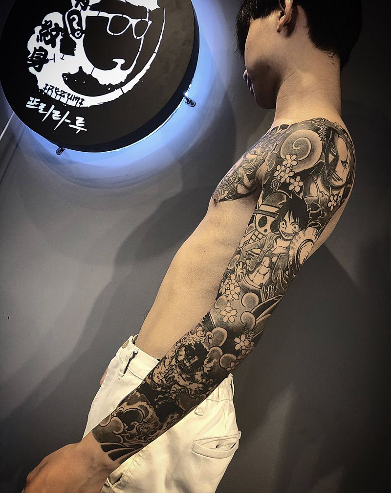 当前位置: 首页 >吉林省延边朝鲜族自治州纹身店-自有纹身纹身图案>海贼王主题花臂半甲完成纹身图片_手臂胸部纹身图案