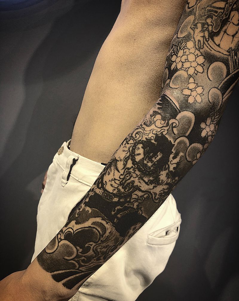 当前位置: 首页 >吉林省延边朝鲜族自治州纹身店-自有纹身纹身图案>海贼王主题花臂半甲完成纹身图片_手臂胸部纹身图案