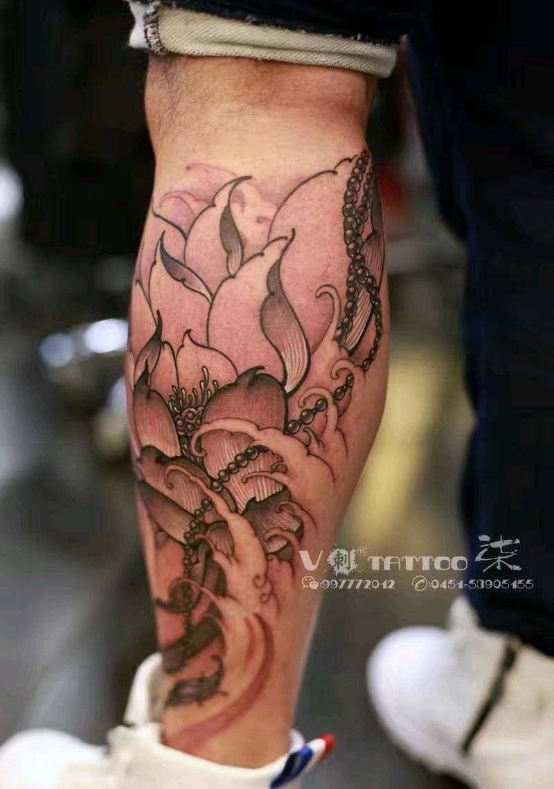 包小腿荷善纹身图片_腿部欧美传统国画植物原创成品纹身图案